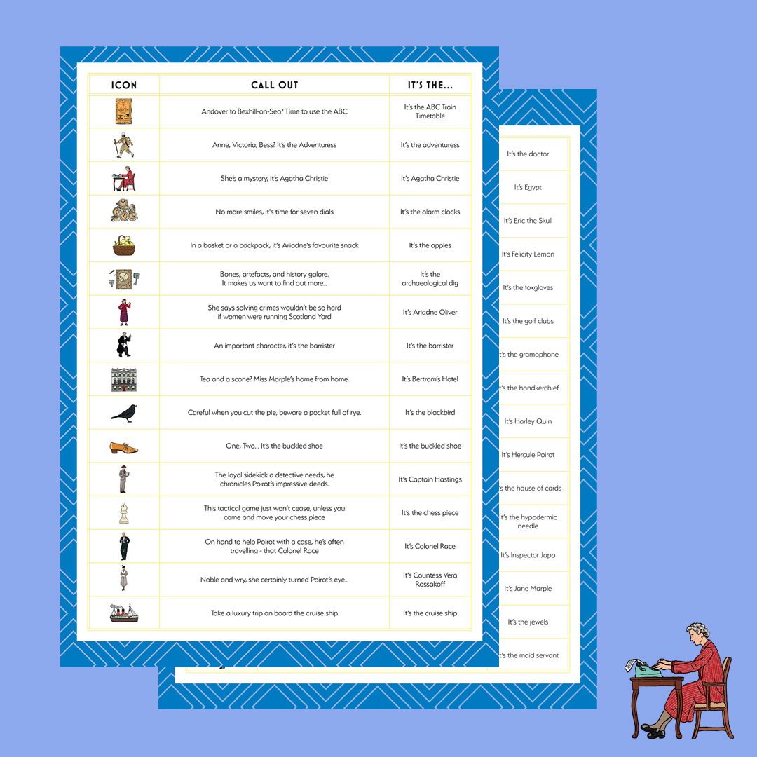 Perfect for a mixed-age group of classic crime fans. Each participant must choose a bingo game card, featuring 15 icons from the Christie universe. Select your caller (get the bingo lingo ready), and let the fun begin! Be the first to score a line win (horizontal, vertical or diagonal) or compete to the end to fill out every icon using the magnifying counters.